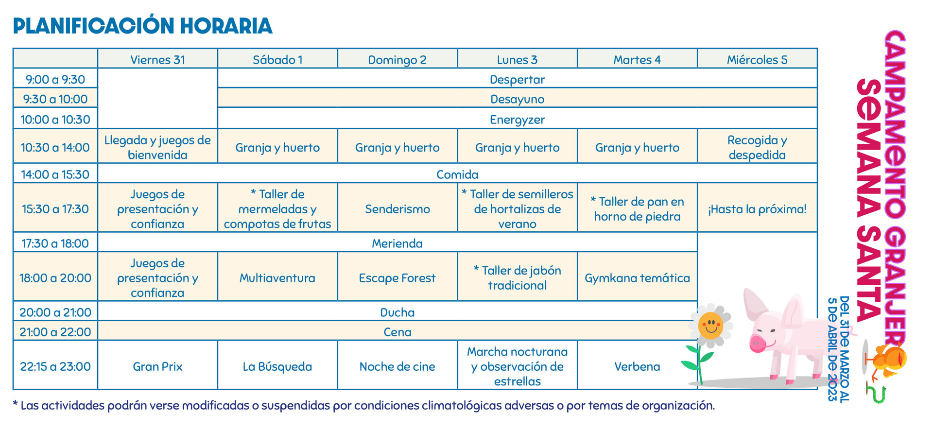 Fecha del campamento: del viernes 31 de marzo al miércoles 5 de abril (seis días).